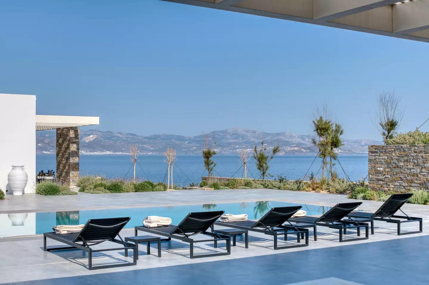 • Terraces and relaxation areas with panoramic views of the Aegean Sea and Naxos Island, ideal for enjoying the Mediterranean lifestyle