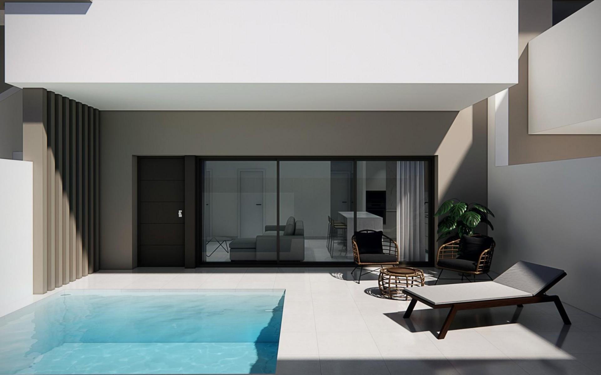 New Build Bungalows for Sale in Pilar de la Horadada 3 km from Beach Boutique Residential Development in Pilar de la HoradadaDiscover this exclusive new build residential complex of modern bungalows located in Pilar de la Horadada, the southernmost town of the Costa Blanca. This boutique project consists of only 14 carefully designed homes with 2 or 3 bedrooms and 2 bathrooms, offering an ideal combination of comfort, style and Mediterranean lifestyle. The development is situated in a quiet residential area within walking distance of the town center, allowing residents to enjoy easy access to shops, restaurants, supermarkets and essential services. Pilar de la Horadada is known for its welcoming atmosphere, traditional Spanish charm and lively main street filled with cafes, boutiques and charming squares. Modern Bungalows with Private Outdoor SpacesThe homes have been designed to offer bright interiors and functional layouts, perfect for both permanent living and holiday use. Ground floor bungalows feature a private garden and private swimming pool, creating the perfect setting to enjoy outdoor living, sunbathing or entertaining family and friends. Top floor bungalows include a spacious terrace and a private rooftop solarium. The solarium comes with a summer kitchen and offers the option to add a private pool or jacuzzi at an extra cost, making it an ideal space to relax while enjoying the warm Mediterranean climate and open views. Each property includes a private parking space within the residential complex for added convenience. Quality Construction and Modern FeaturesThese new build homes are built with quality materials and modern installations designed to ensure comfort and energy efficiency throughout the year.Aluminum exterior carpentry with thermal breakFully fitted kitchens with included appliancesBathrooms equipped with mirrors and shower screensInterior and exterior LED lightingHot water system with energy efficient aerothermal technologyPre installation for ducted air conditioning The combination of modern design and practical features makes these homes an excellent option for buyers looking for a contemporary property on the Costa Blanca. Excellent Location Close to Beaches and GolfPilar de la Horadada enjoys a strategic location close to some of the best beaches and golf courses in the region.Torre de la Horadada beach 3 kmMil Palmeras beach 3 kmLo Romero Golf 6 kmRegion de Murcia International Airport 45 kmAlicante Elche Airport 75 km The area also offers excellent road connections to nearby coastal towns, marinas and leisure facilities, making it a perfect base to explore the Costa Blanca and Costa Calida. Find Your New Home on the Costa BlancaIf you are looking for a modern new build bungalow near the beach with excellent amenities and a fantastic location, this residential development in Pilar de la Horadada is an outstanding opportunity. Contact us today for more information or to schedule a visit.