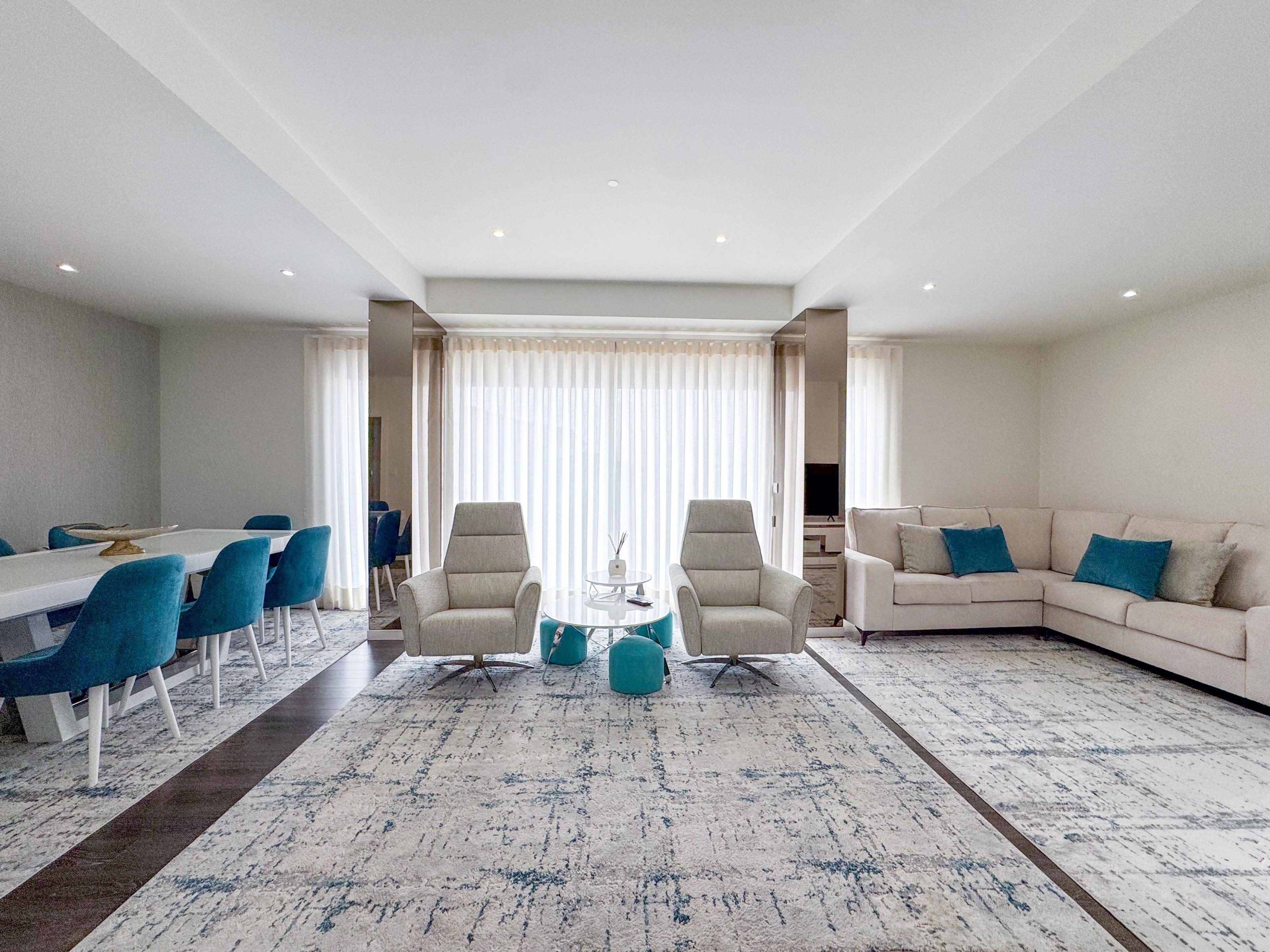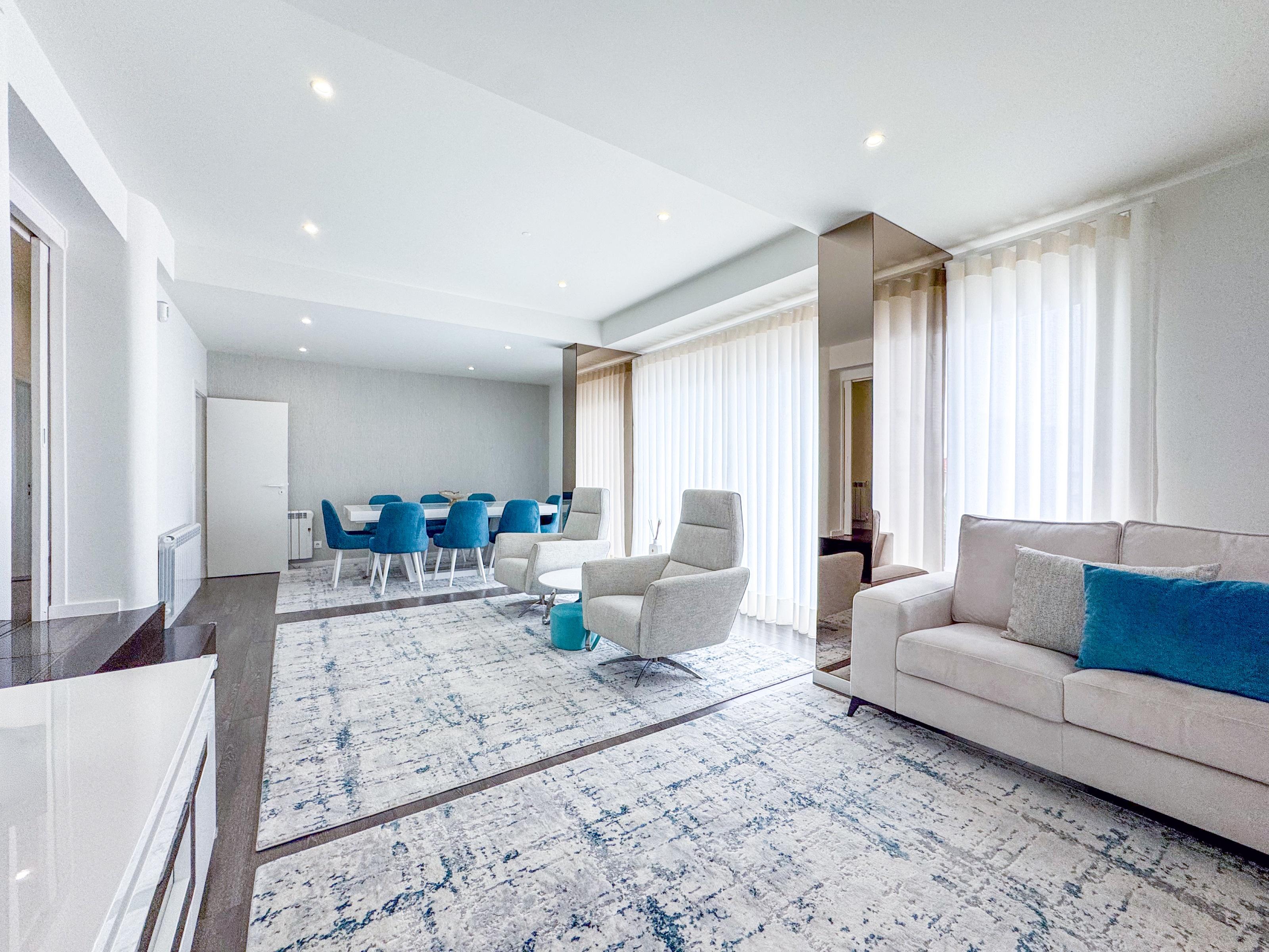 The interior features a spacious and bright living room, ideal for socialising and leisure, with direct access to the modern kitchen, fully equipped with oven, refrigerator, microwave, dishwasher, washing machine and dryer, integrated in the laundry room. The five bedrooms, all with built-in wardrobes, offer flexibility for family accommodation or the creation of work areas. The master suite has a walking closet, providing privacy and organisation. All rooms benefit from double-glazed frames, thermal and acoustic insulation, enhancing comfort throughout the year. The interior design is sober and contemporary, favouring natural light thanks to the favourable solar orientation.