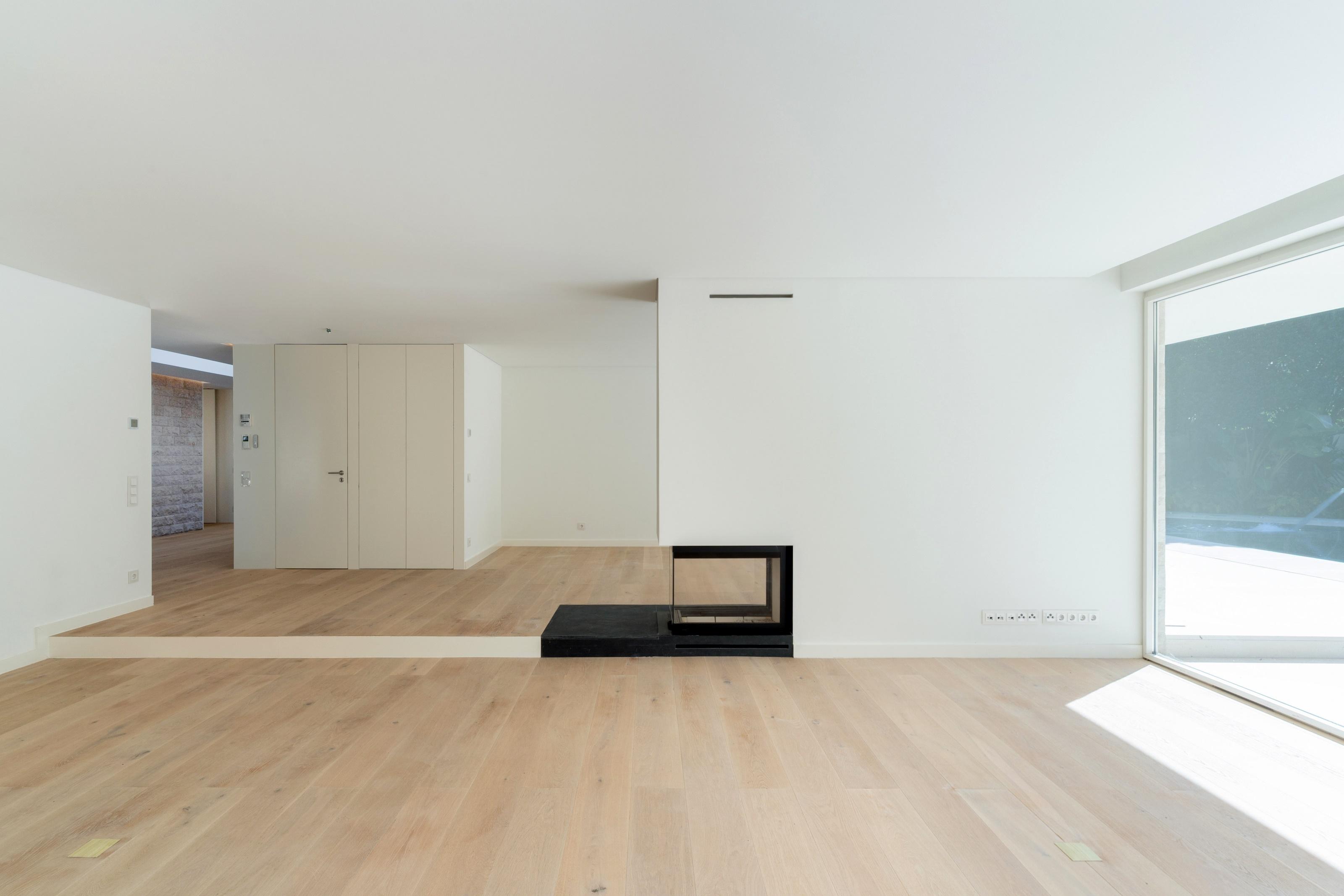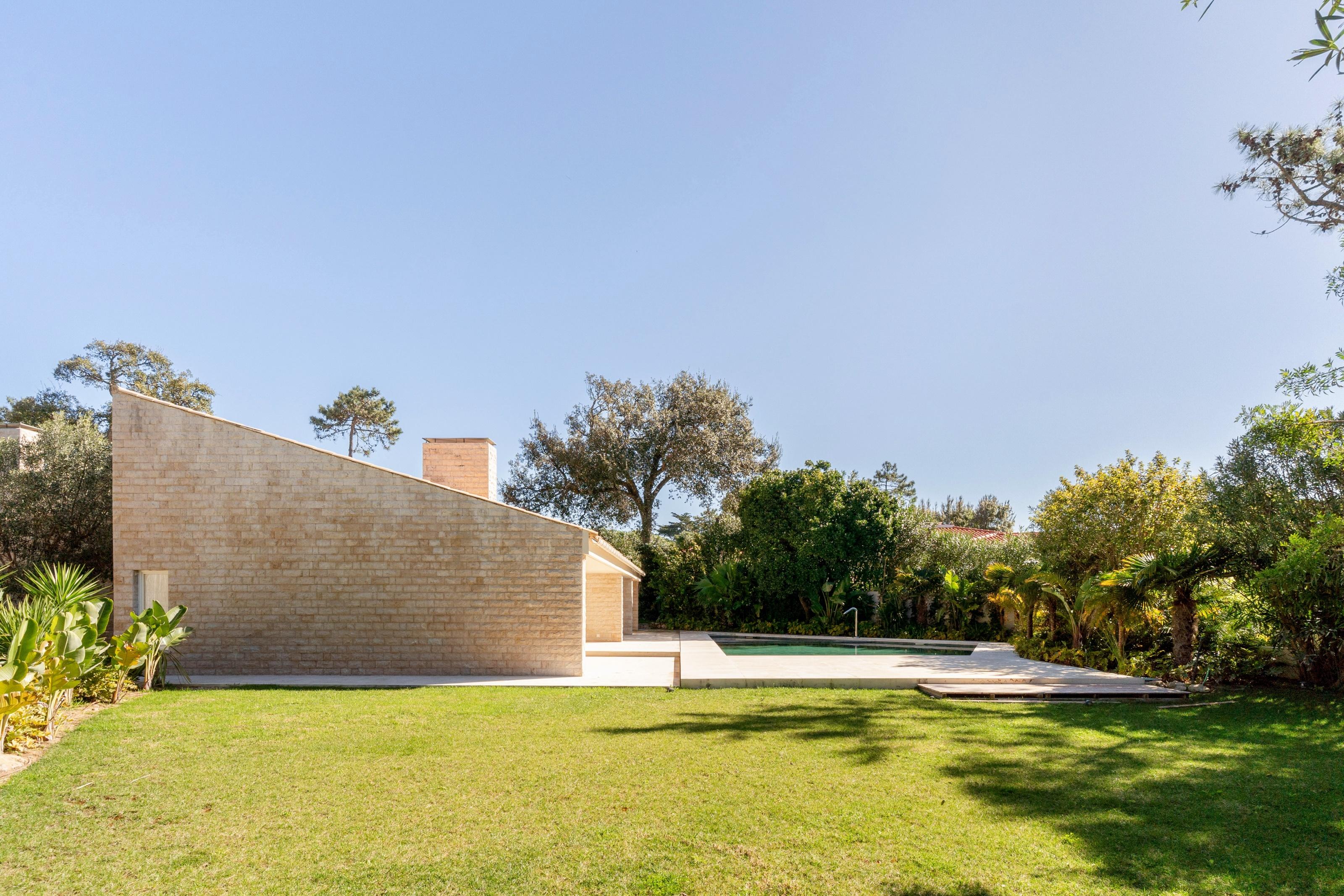 The villa comprises a spacious entrance hall and living room divided into two areas separated by a fireplace with heat recovery system. The Italian-designed kitchen features an Estremoz marble island. The master suite spans 65 sqm, including a hall, walk-in closet, and a space that can be used as an office with sliding doors. All these spaces have direct access to the garden. There is also another suite and two bedrooms served by a bathroom. On the lower level we find a multipurpose room, bathroom, three-car garage and machinery room.