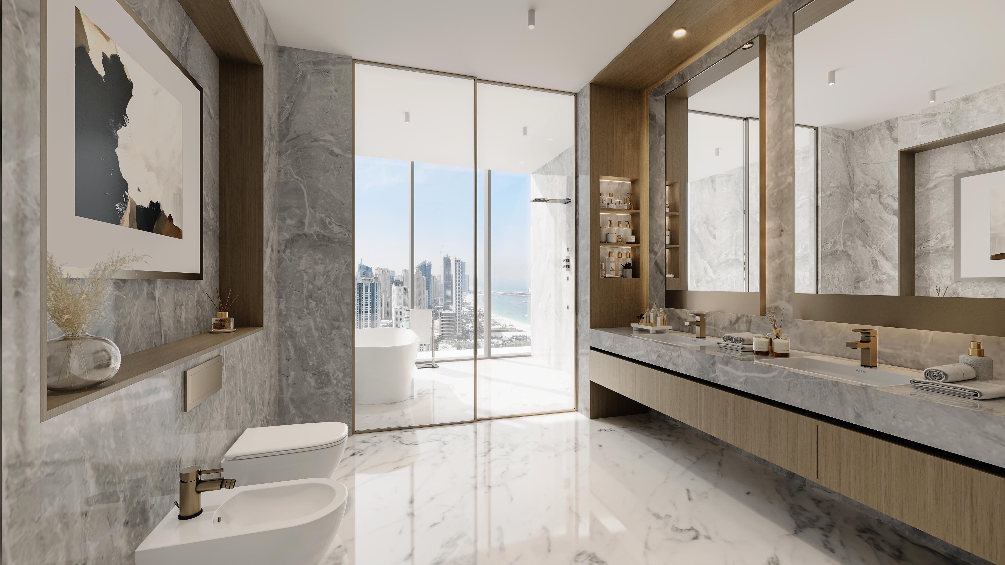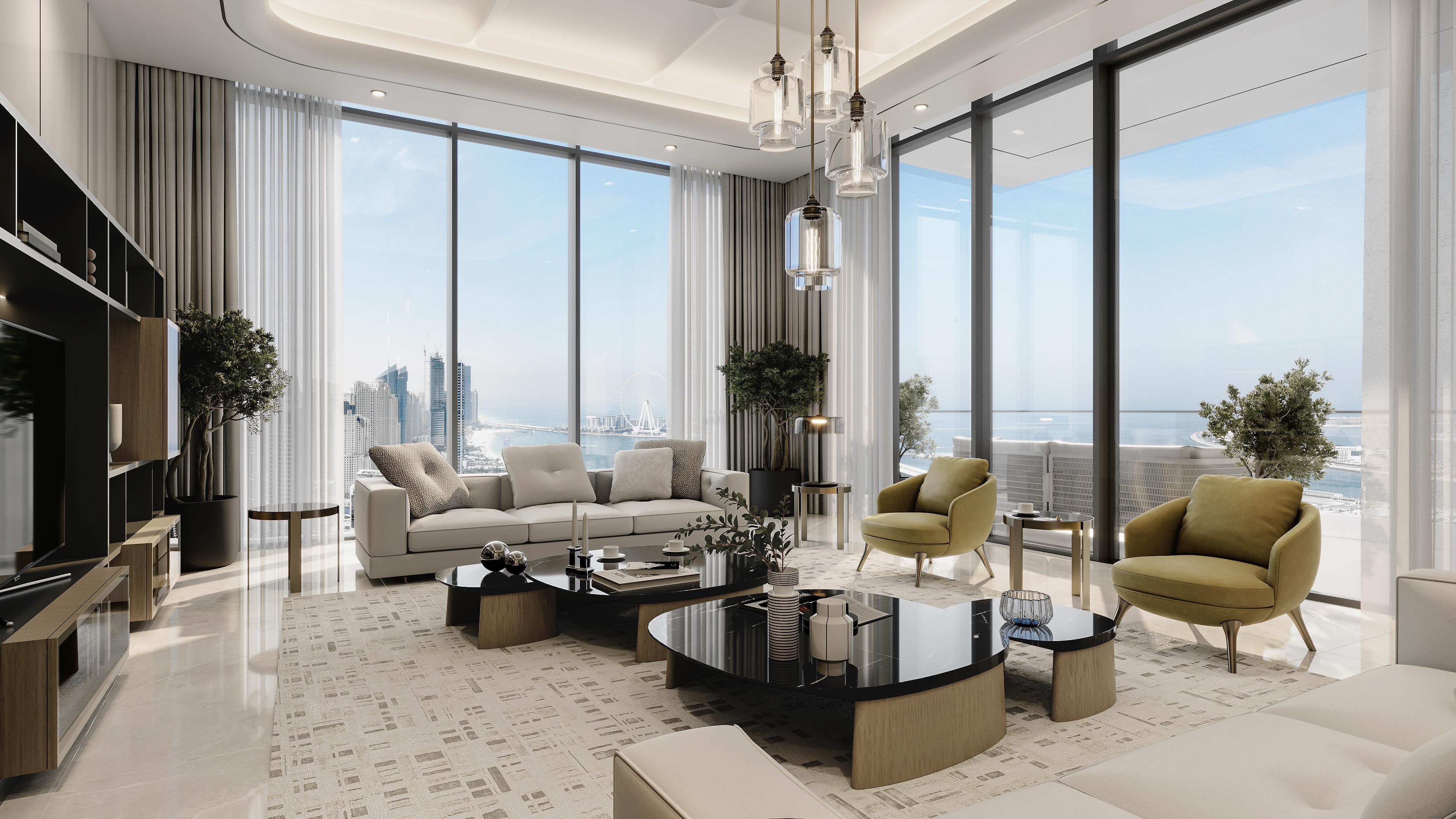 Panoramic Ocean Views: Wake up to the stunning vistas of Dubai Harbour, with the skyline, ocean, and iconic landmarks like Palm Jumeirah and Ain Dubai in full view.