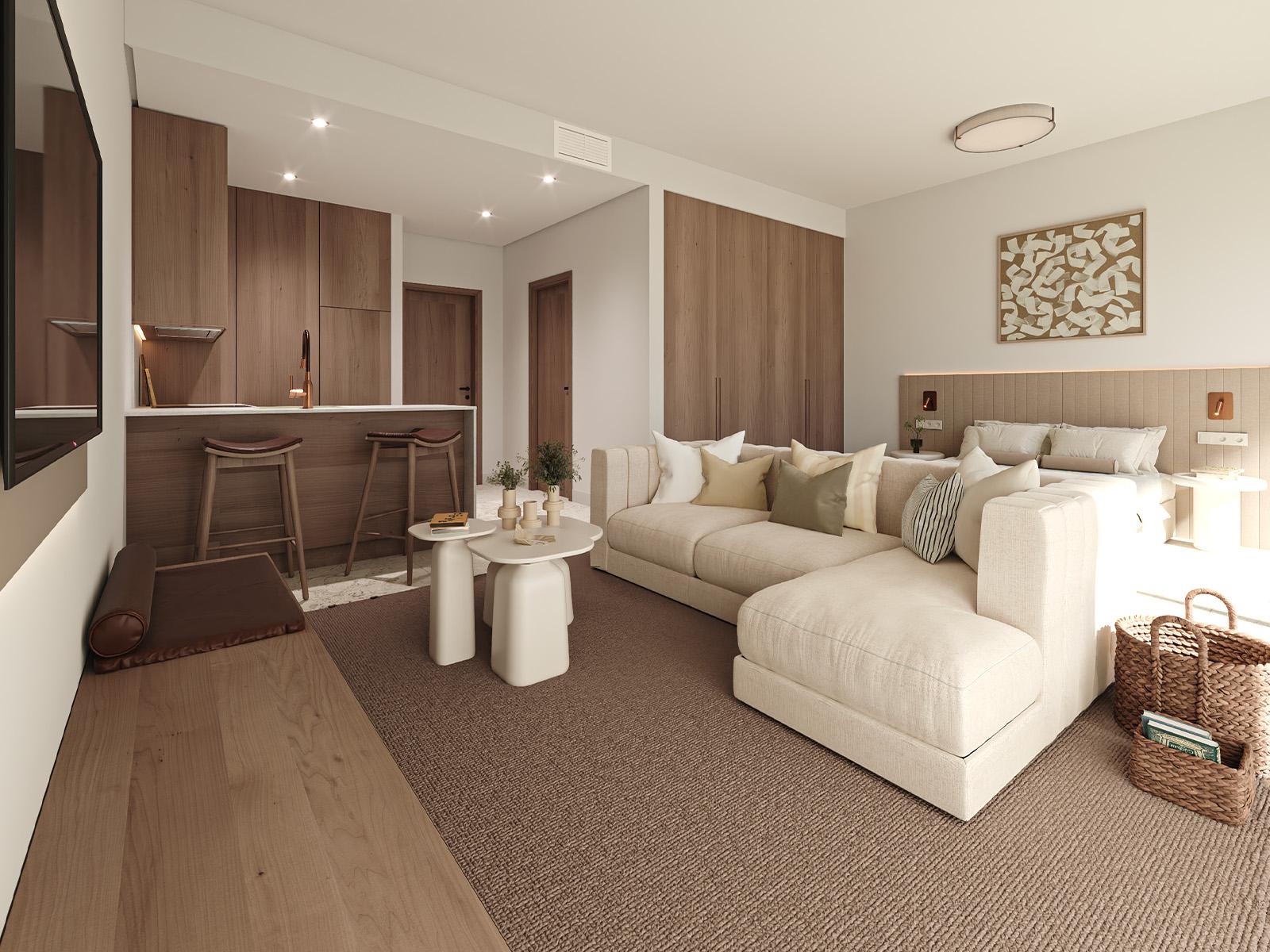 Studio flat of 45m2 and balcony of 11m2, in a new condominium next to the beach, in Carvoeiro, Algarve.