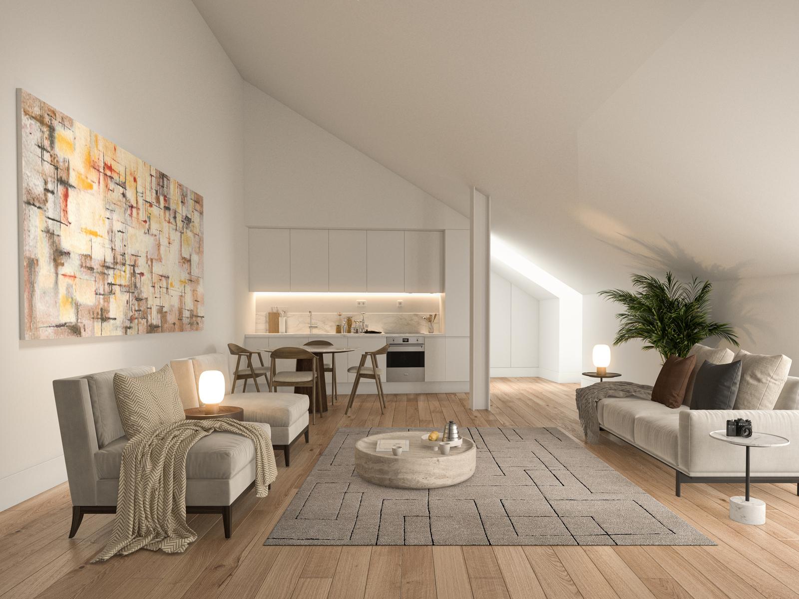 Studio with 119 m2 of total area, 44 m2 of private gross area and 77 m2 in hiding, inserted in the new residential development to be born on the riverfront of Lisbon, next to Cais do Sodré, between Chiado and Santos, where history and modernity intersect.