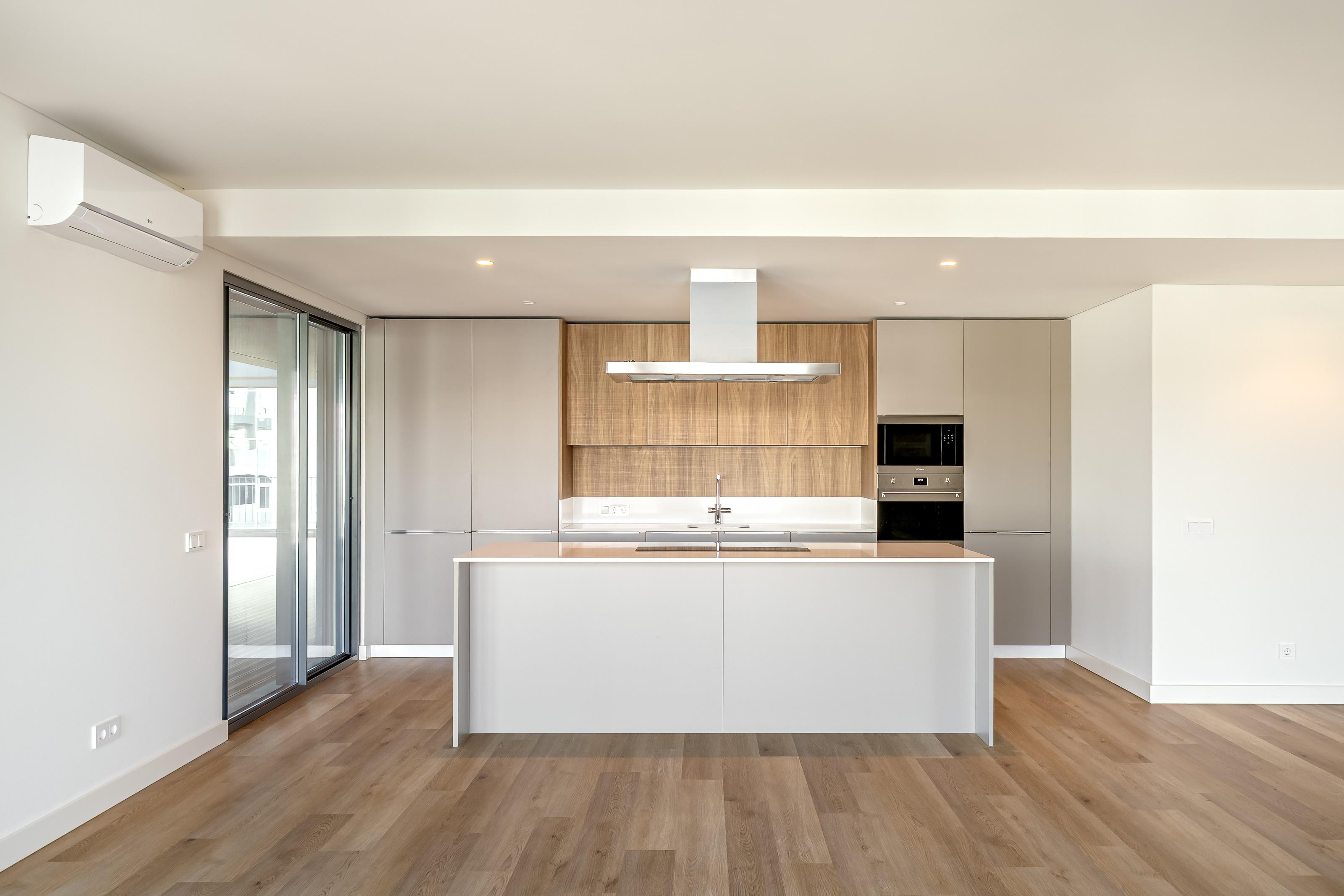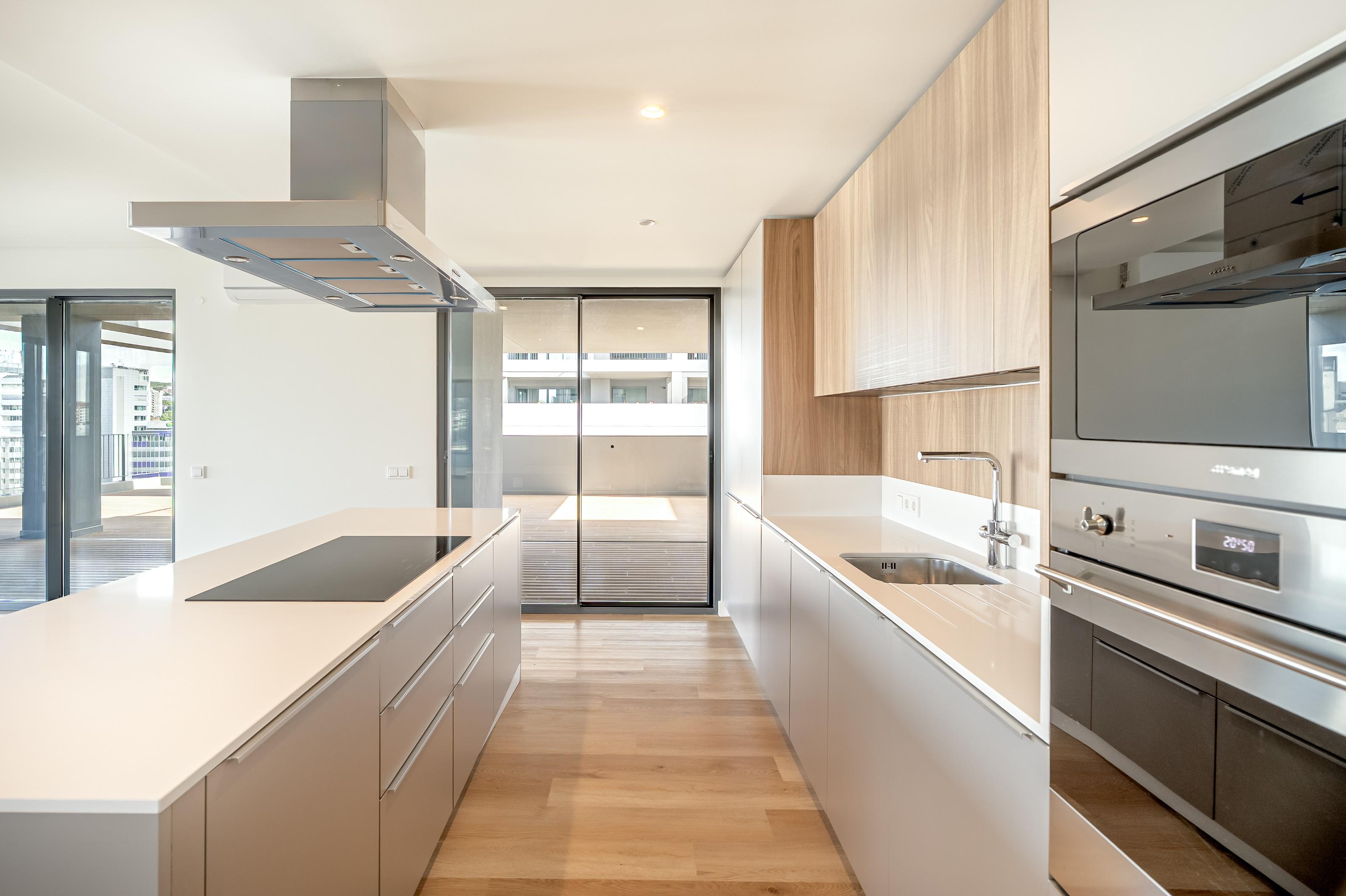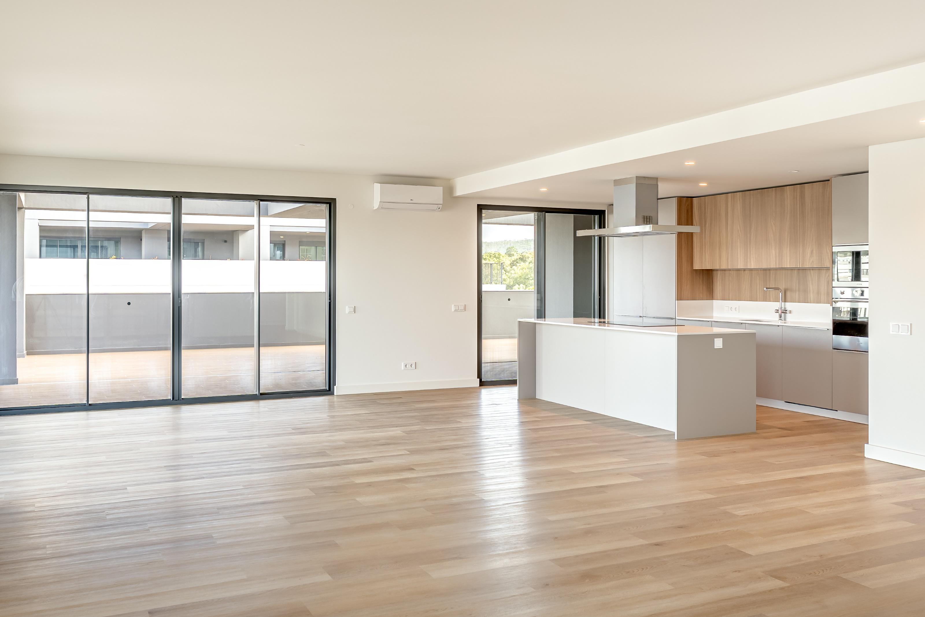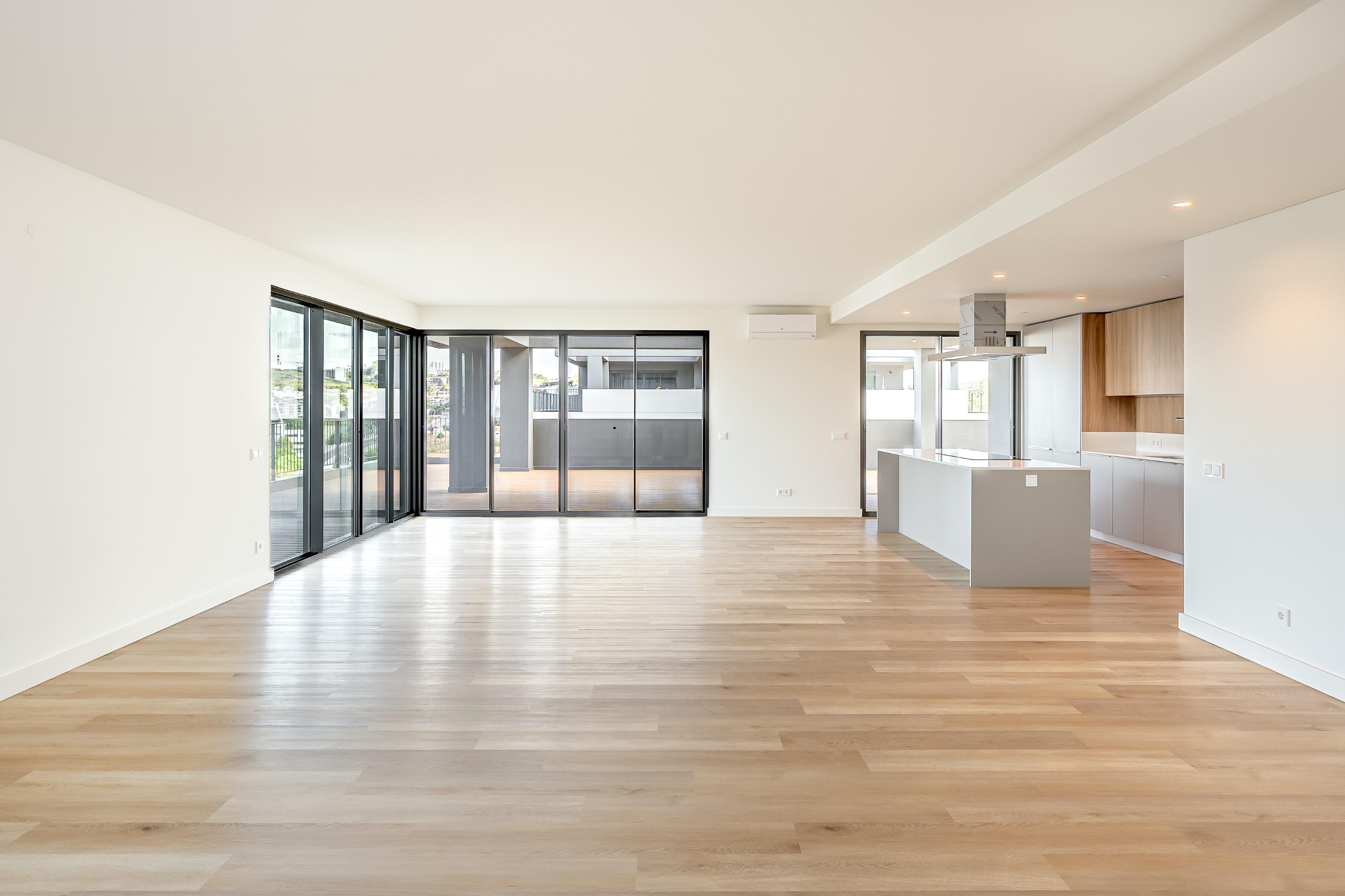4-bedroom penthouse apartment with 243 sqm of gross private area and 202 sqm of terraces and balconies in decking, with unobstructed views, three parking spaces and storage room, in the prestigious condominium with communal pool, Terraces Mirear, in Miraflores, Lisbon.
