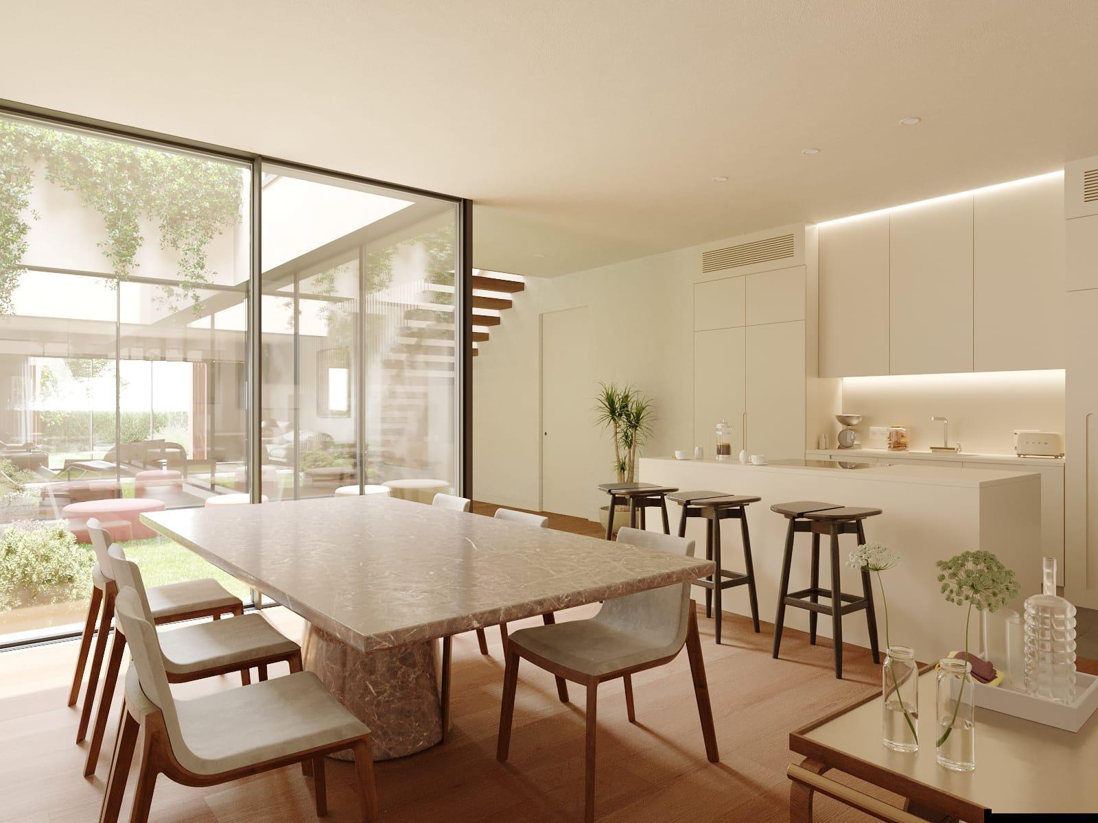 The Vila Tijolo residences in Campo de Ourique and Estrela areas, offer a unique lifestyle in Lisbon. With a privileged location, the properties offer easy access to a wide range of amenities and points of interest, making them a desirable choice for those wishing to live in one of the city’s most vibrant and charming areas.As the property is classified as a Municipal Interest Property, the intervention designed for Vila do Tijolo includes extending the existing building and respecting and recovering its history and unique characteristics.The generous plot of land (total area of 2,496.90 square meters) has allowed the extension of the existing building in three volumes: the original Vila do Tijolo building (28 residential units), the Art Deco building (2 residential units) and the townhouse complex (5 residential units), creating a total of 35 residential units.The primary pedestrian access to the development is via Rua Possidónio da Silva, through the Art Deco building. This leads to an extensive garden area from which you can access all units.The green area within the plot is one of the great attractions of this development, not only because of its size but also because of the attention given to the landscaping project, which includes tree species suitable for qualifying the space and creating various leisure areas.As far as Vila do Tijolo’s amenities are concerned, highlights include the development’s original entrance hall, with an area reserved for drop-off lockers; the gym; the communal swimming pool; the large garden; the parking area with sockets for charging electric vehicles; and five garages for the villas. There is also an area for individual storage and a space for washing equipment such as bicycles.All units in the Vila do Tijolo development have a home security system and an NOS Smart Home intelligent system for more efficient and sustainable home management.Campo de Ourique is recognized as one of the most attractive places to enjoy community life. It has many shops, restaurants, cafes, and pastry shops, as well as the local market and educational institutions such as the Salesianos. All this makes the experience of living in this family-friendly location unique in Lisbon. The proximity to the historic center and Marquês de Pombal, as well as easy access to the International Airport and Cascais, just 20 minutes away by car, make Campo de Ourique an excellent location.